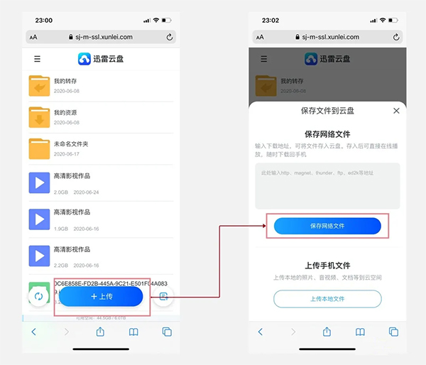 想要下载磁力链、BT 种子、EMule 等其他链接,可以先在浏览器打开 pan.xunlei.com,在网页内填写资源下载地址,点击存入云盘,然后在网页内登录迅雷账号,点击【上传】按钮,输入资源下载地址,并点击【保存网络文件】;