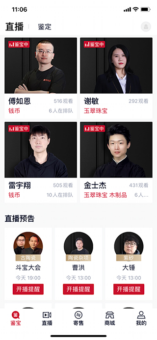 3、可以看到当前的直播鉴宝和直播预告的房间,包括钱币、书画、文玩杂项、玉翠珠宝等各种各样的类型,选择感兴趣的即可进入观看,