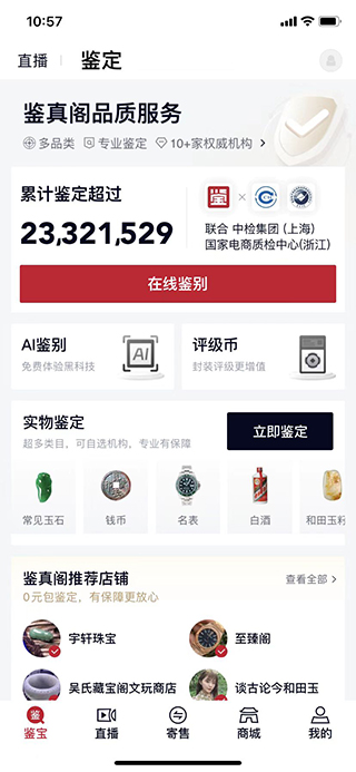 2、进入应用主界面,包括【鉴宝】、【直播】、【寄售】、【商城】和【我的】栏目,