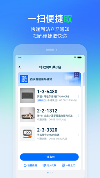 无需取件码,使用菜鸟APP扫一扫即可一键取出自提柜和驿站包裹。