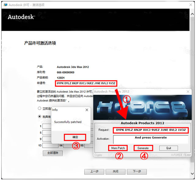 3、先粘贴激活界面的申请号至注册机中的Request中,点击Generate算出激活码,在注册机里点Mem Patch键,稍后提示会成功;