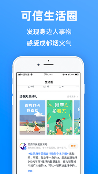 天府市民云ios是针对苹果用户特别研发的一款关于天府之国成都的地方生活服务软件,它以“互联网+市民服务”为核心,支持网享天府、信手服务,购房摇号、一手掌握,文化活动、轻松查阅,我的服务、随心配置等特色,涵盖了网上办事、信息沟通、交通出行、医疗服务等用户生活的方方面面,能为用户提供文体教育、民生保障、就业创业、家庭生活、交通旅游、健康医疗、环境气象等全生命周期服务。同时,该软件所有数据均来源于各相关部门的基础数据库,得到了成都本地信息化部门的许可和认证,因此数据真实有保证,且在市委市政府的坚强领导下,它还获得了31个部门的全方位支持,可轻松实现政务服务跨层级、跨地域、跨系统、跨部门、跨业务的协同,是您生活出行不可或缺的手机应用,需要的朋友请下载!