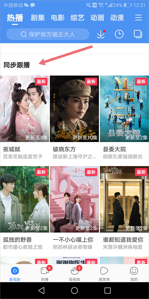 当然如果用户不知道自己想要看哪个电视剧可以进入软件主页面中的【同步跟播】,在里面选择一个最新的电视剧进行追剧。